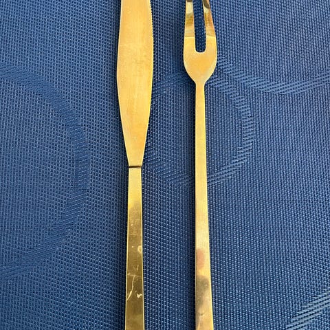 Rustfrit stål, Forskærersæt, Amboss Austria, Et smukt østrigsk forskærersæt fra midten af 50érne, bestående af en plejekniv, en kødkniv og en gaffel. Ud af 2050-serien, designet af Helmut Alder, udført af Amboss Austria i 1950'erne. Service i høj kvalitet, lavet af børstet og poleret rustfrit stål. Længde på den længere kniv: 14 tommer.