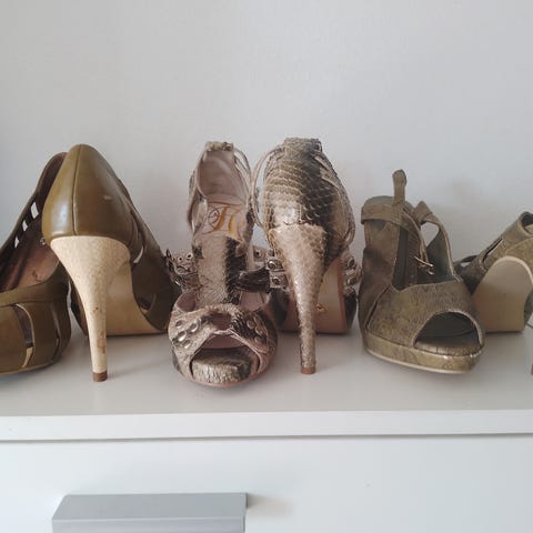 1. Obsessions. str. 37. Grønne slangeskind, plateau. Ubrugt. Hælhøjde 11 cm. "pude" i så behagelige gå i. Lidt ridser efter sko i kassen. Kr. 200