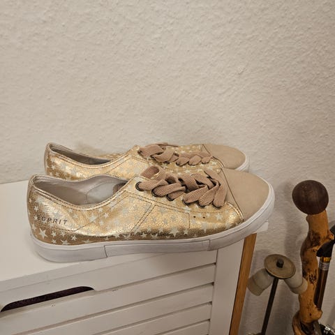 Esprit sort glimmer slipper str 37. Har gået med meget lidt, da det ergonomiske ikke var mig. Har filet et af de ergonomiske højdepunkter ned, se billede, men mere behagelige af gå med efter. Fremstår i pæn stand. Jeg sender ikke med fix og færdig, men med dao.