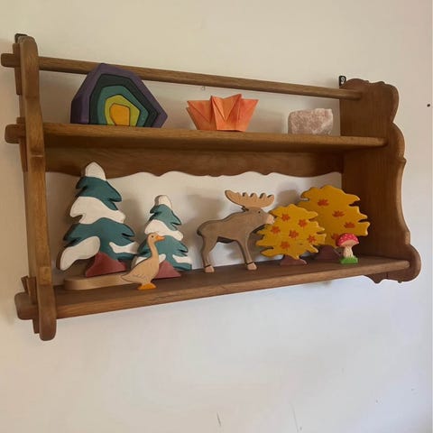Hylde, hylde med håndskårne udskæringer af en engel. Det er bejdset hårdt træ, formodentlig eg. Et arvestykke der kommer fra en stor gård, uvist hvornår den er fremstillet, men meget gammel. Hylden måler 55 x 27 cm