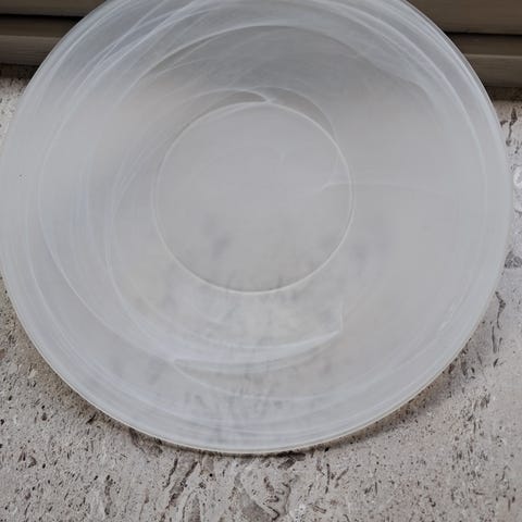 Kagefad formet som et blad. Der er et gråt motiv af en blomst og nogen mindre. Der er en sølvkant som er meget lidt slidt. Der er intet stempel bagpå udover et X trykket ned i porcelænet.