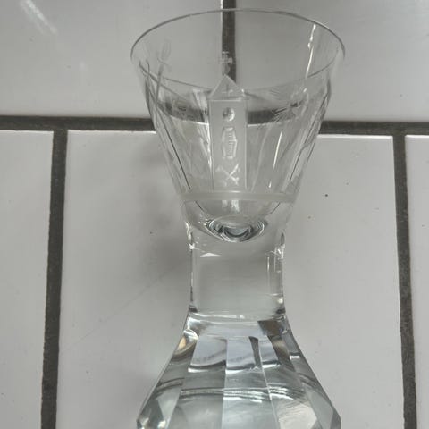 To fine frimurer glas på hhv 12,5 og 13 cm i højden. Det ene er knækket i bund det andet kugleslebet i bund. Begge med indgravering af passer og vinkel. Ser ubrugte ud og g fremstår rigtig pæne uden skår/afslag.
