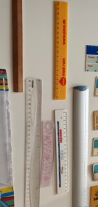 Masser af linealer i træ og plastik. Fra ca. 0-40 cm. Flere størrelser, længder, designs og udformninger. Se billeder. Plast op til 20 cm - 10 kr. pr. stk. , plast 30 cm - 15 kr. og træ 25 kr. pr. stk.
