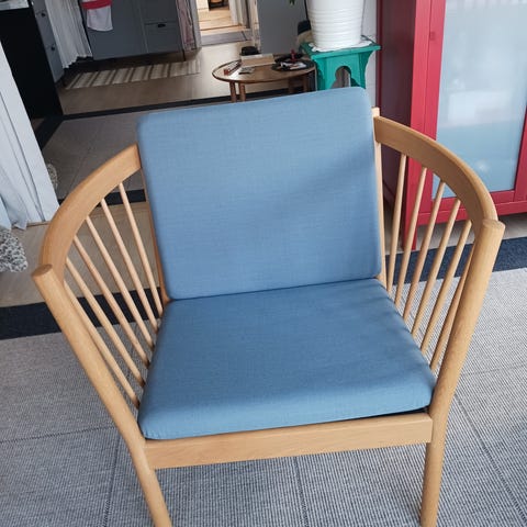 1 stk smuk J146 lænestol fra FDB Møbler designet af Erik Ole Jørgensen. Stolen er i lakeret eg med hynder i farven Dusty Blue. Den fremstår i meget flot stand uden brugsspor, da den stort set ikke har været brugt.