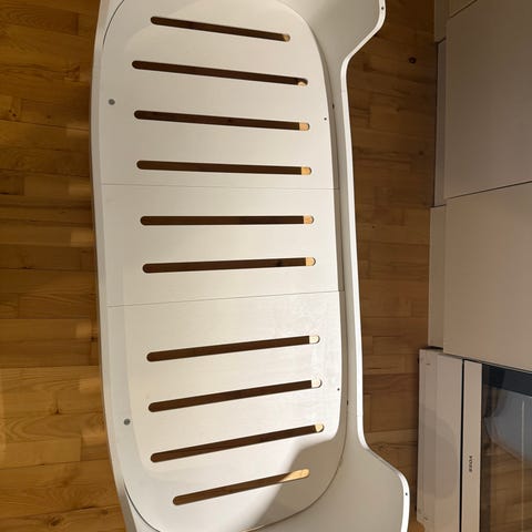 Ikke brugt til meget søvn, da vores søn altid har foretrukket at sove med sine forældre. Madras og seng fremstår derfor som ny- ingen uheld i sengen og ingen pletter, hakker eller slidtage.