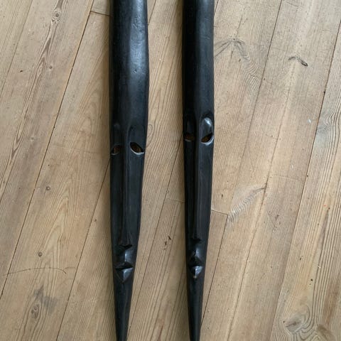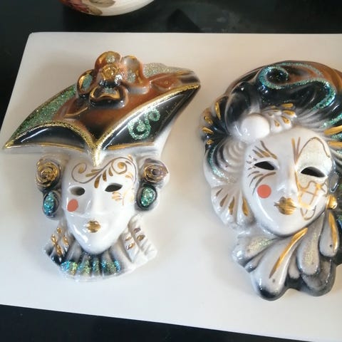 2 masker, Hvid og sort - fine og intakte. Meget dekorative. Med ophæng. Mål højde 19 bredde 9,5.