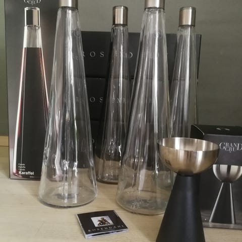 Vin / vand karaffel, samt vin tragt Grand Cru (ilter / dekanteringstragt) og et salt og pepper sæt fra Rosendahl sælges.