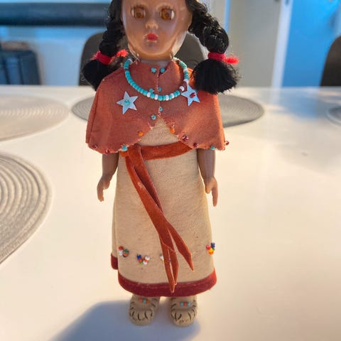 Native Carlson vintage dukke fra 1940’erne.Den er intakt.Ved ikke om der har været en bue f.eks. ?Dukken måler ca 19 cm