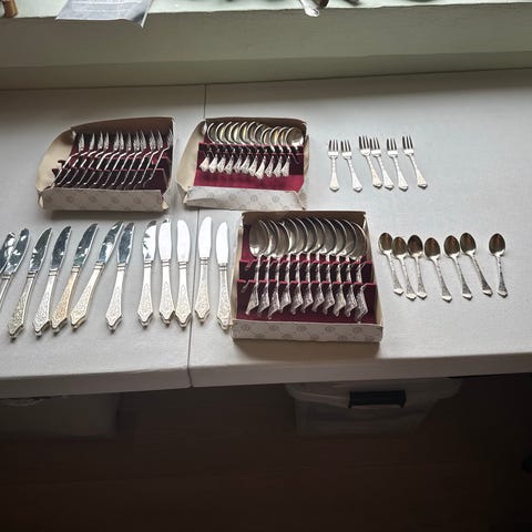 Bestik, Patina Messing Bestik, 11 knive / 12 gafler / 12 skeer / 12 teskeer / 1 stegegaffel / 1 skærekniv / 1 kartoffelske / 1 sovseske (kan også bruges som salat bestik) / 1 oplukker / 1 nøddeknækker. Samlet pris ekskl. bestikkurv. Jeg kommer til København 1 gang pr. måned, hvor varen evt. kan afhentes i Herlev
