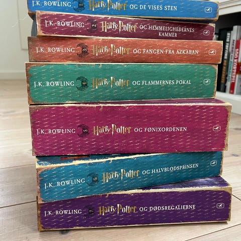 Harry Potter paperbacks af J. K. Rowling med guldskrift og sorte kanter, sjældne og udgået fra forlaget.