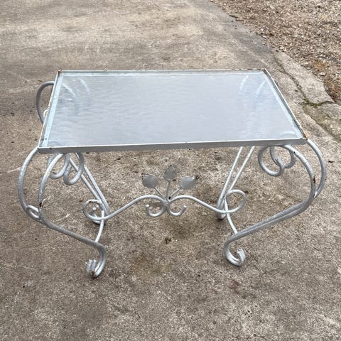 Flot blomsterbord / lampebord selve bordpladen har en revne. Men bordet er stabilt. Det er vist på en af billederne. Højden er 73 cm. Diameteren på bordet er 40 cm