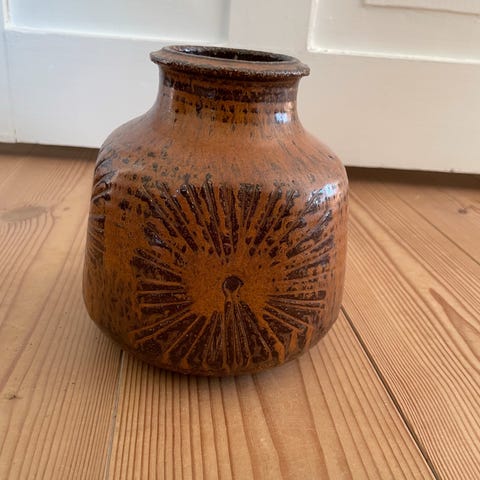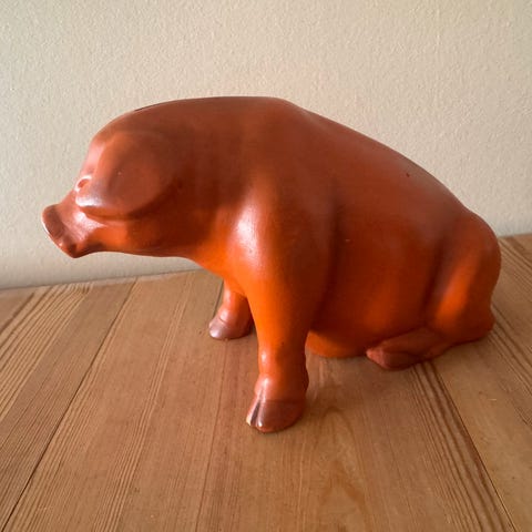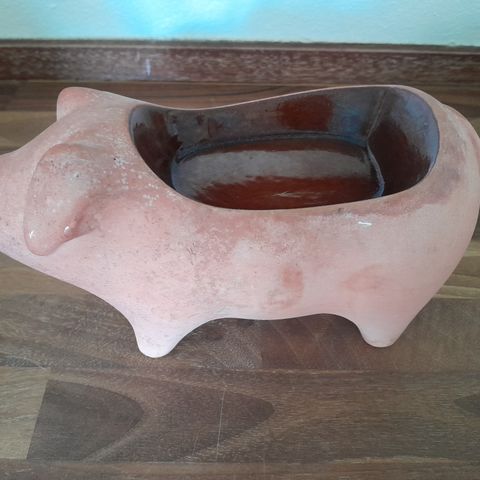 Sjov gammel gris med karse beholder på ryggen. Bemærk pletter og patina. Sendes med DAO eller GLS til pakkeshop for købers regning, 45 kr.