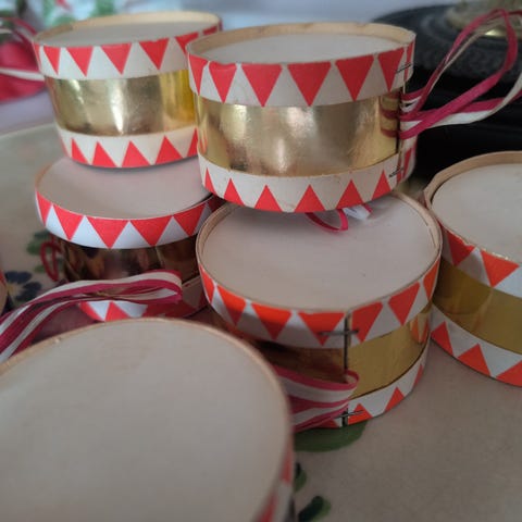 7 gamle trommer med hank . 5 i guld 1 blå og 1 grøn .