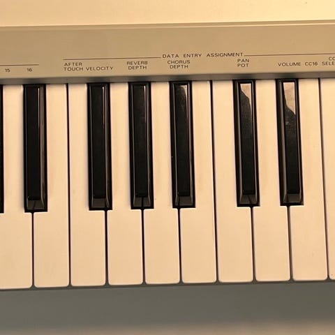 1 knækket hvid D tangent limet på med superlim, så den er klar til brug, dog betragtes den som skal repareres, så der ikke er noget fårebrok. Vintage keyboard. Prisen er urokkelig.