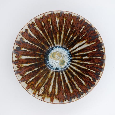 Stentøj, Skål, Stor skål med en helt vild farverig og nuancerne glasur. På ydersiden er den hovedsageligt sort med plamager af hvid/grøn løbende glasur. Indvendig er der en del mere af de løbende glasur, men samtidig også med en orange/creme glasur omkring bunden. Nede i bunden er glasur farverne blevet blandet i et tyk lag, der har skabt et lag krakeleret farvet glas.