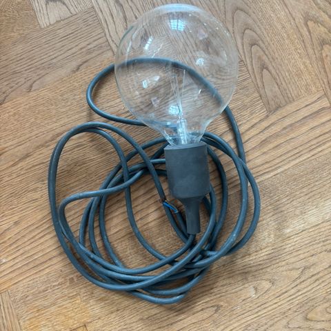Pendel, Muuto, 2 stk sorte Muuto E27 pendler ophængt i en hvid metalskinne (57,4 cm bred). De sorte ledninger mellem lamper og skinne er hhv. 60 og 65 cm. Den hvide ledning efter skinnen er 310 cm. Med lysdæmper. Pærer kan udskiftes, men virker endnu.