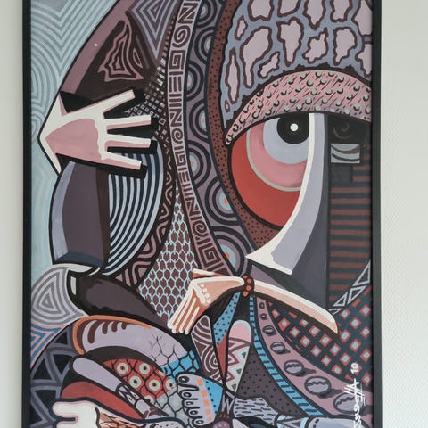 Et maleri af en afrikansk landsby, og billeder af afrikanske kvinder