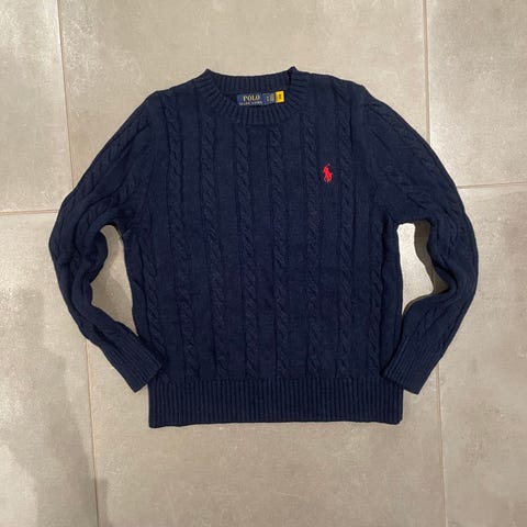Sælger en aldrig brugt og klassisk Ralph Lauren striktrøje i eksklusiv mørkegrå merinould. Str. Small – perfekt til dig, der ønsker et stilfuldt og tidløst look i høj kvalitet.