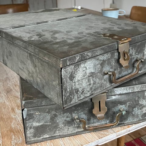 Længde 42 cm. Bredde 26 cm. Højde 8 cm. Fin til opbevaring af dokumenter.
