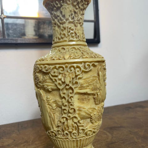 Lampe hjembragt fra Japan. Klassisk rød farve med malede planter i sort. Ca 35 cm høj inkl fatning.