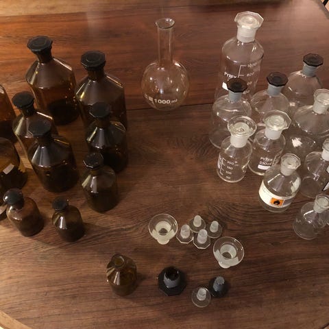 Laboratorieglas – mundblæst, emaljeetiket “Alkohol”, ca. 1900