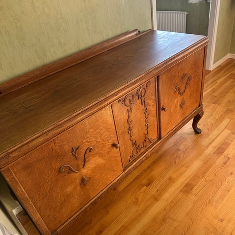 Gammel antik egetræsskænk med facetslebet spejl.
