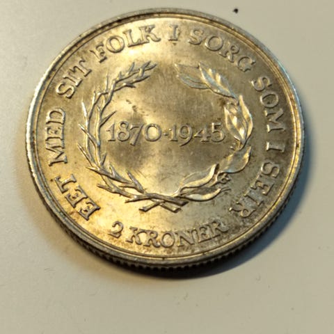2 Krone 1945 - Christian X Konge Af Danmark - Eet Med Sit Folk I Sorg Som I Seir 1870 - 1945 ( Pris kr. 80,- ) ( SOLGT )