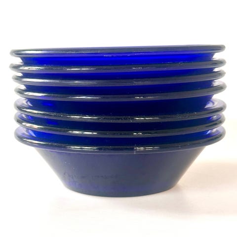 Sæt med 6 stk. mundblæste ymerskåle i koboltblåt glas, hver med en højde på ca. 4,5 cm og en diameter på ca. 14,5 cm. Alle skåle har et tydeligt “knæk” i bunden, hvilket er karakteristisk for mundblæst produktion, hvor glaspusteren afslutter formen med et aftryk eller brudpunkt i glasmassen.