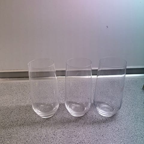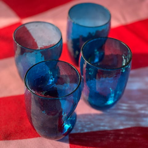 6 x vandglas i en flot blå pastelblå farve. Glassene har en slags blade eller blomster mønster / prægning i glasset