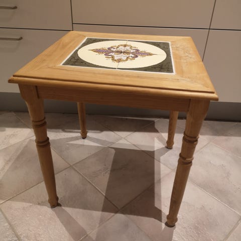 Det ville pynte at få træ kanten langs fliserne slebet, så den matcher udtrækspladerne. Man kan også vælge at sætte helt nye fliser i bordpladen.