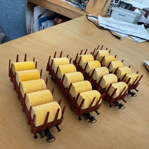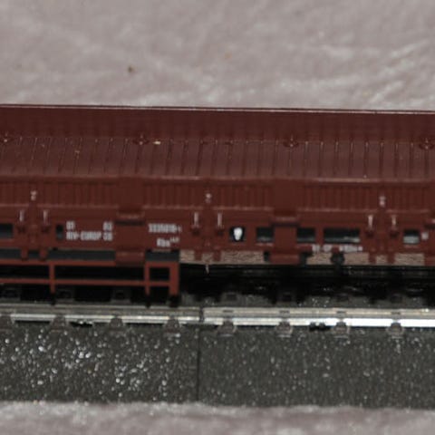 Speciel lang boogie godsvogn med kæpskinner, som kan lægges ned.