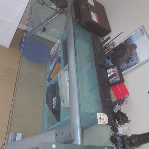 Fint glas skrivebord. På det dybeste er bordet 80 cm, på det smalleste 40 cm.