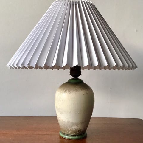 Elegant bordlampe med tung, støbt fod og smuk opalglas-skærm i klassisk stil.