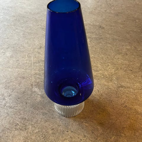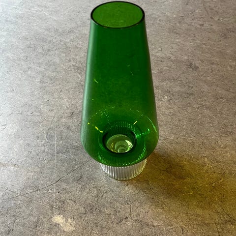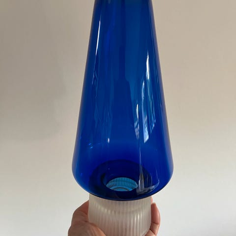 Hermed to ualmindeligt smukke udgaver af “Hyggelampen” designet af Lütken for Holmegaard. I Holmegaards katalog fra 1967-73. Forholdsvis sjælden at finde i original stand og et par. Måler 26 cm. Dia. bredeste sted 12 cm. Smid et par stearinlys i dem og ikke et øje er tørt. Set til 1200,- på nettet. Se mine øvrige annoncer for mange spændende ting