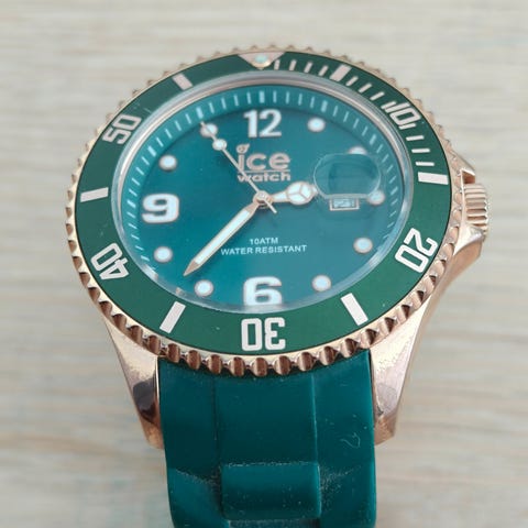 Ubrugt, marine blå urskive og rem med rose gold urkasse.