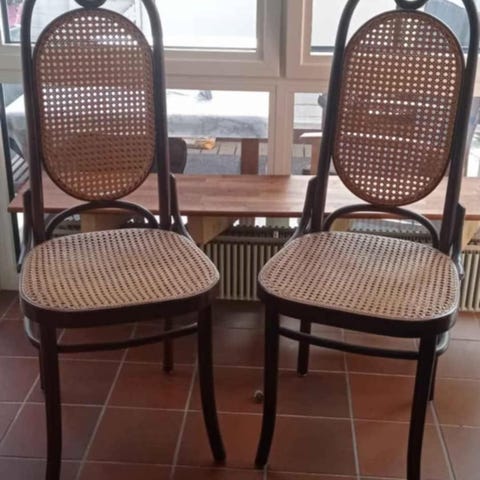 Sæt af 2 højryggede wienerstole med støtter/forstærkning i siden. Stolene er i god stand. Stolene måler 44×51 cm siddehøjde 46 cm ryghøjde 110 cm.