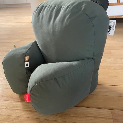 Ukendt grønt ryglænspude i polyester. Velegnet til støtte og komfort. Perfekt til brug på gulvet eller sofaen. Og Barnevognen