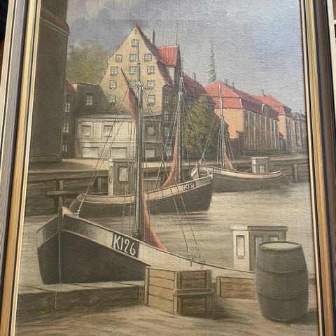 Oliemalet lærred. Signatur: Darvig. Tekst bagpå: Vognmandsgade- Dragør (Med ramme: 32,5 højde, 41,50 bredde, 3,4 dybde. Uden ramme: 27,8 højde, 36,8 bredde) På ramme: enkelte ridser