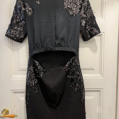 Ubrugt, Super flot fest ny kjole med pailetter i nederdelen. Der er udskæring på skuldrene. Øverste del er tul med undertop. Det er en meget flot kjole, som kan bruges til mange forskellige fester. Farven er sort, ny og ubrugt, og der er stadigvæk mærke på. Str S/M