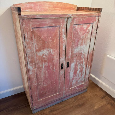 Mahognifarvet. Alt er intakt. Er sat sammen i to sektioner, hvor det med skufferne er for sig og resten i et.