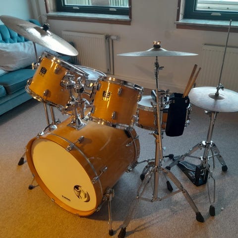 Sættet er med stortromme/pedal, 3 tam'er/stativ, hi-hat stativ, stativ til "gulvtam" med plads til bækken, lilletrommestativ og 2 stativer til bækkener samt stativbag med hjul, stickbag og lidt ekstra guf, se billeder