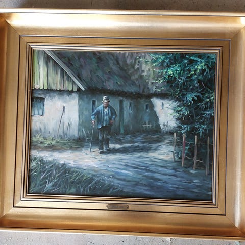 Oliemaleri, Arling Gade, motiv: Dyr, stil: Naturalistisk, b: 51 h: 61, 3 køer foran ejendom.