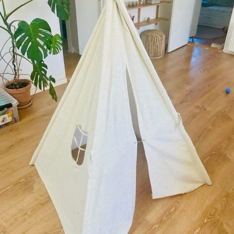 Legetelt, Tipi, legetelt, Hey Sunshine, Tipitelt fra Hey Sunshine, i fin stand, med tæppe. Tæppet måler 130 cm i diameter og teltet er ca 175 cm højt. Tæppet er lidt falmet på den ene side, men fint og pænt på den anden side.