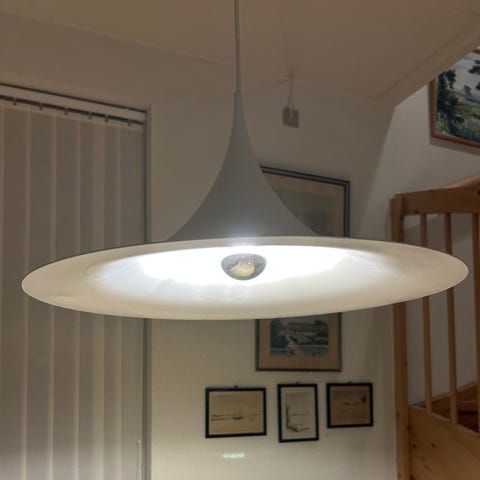 Helt uhørt flot stand af en 40 år gammel lampe både på ydersiden og så er den helt hvid indeni. Den smule der er på kan ikke fotograferes, så standen beskrives som næsten som ny.
