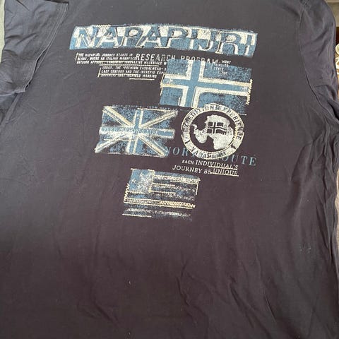Blå herre striktrøje i størrelse L. Trøjen har lange ærmer og et stribet mønster. Napapijri
