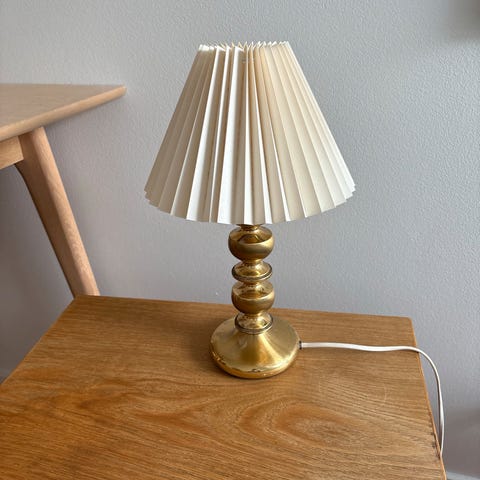 Vintage messing bordlampe med dekorativt design. Lampen har en elegant messingfinish og er ideel som et stilfuldt indretningselement til hjemmet. Velegnet til stue eller soveværelse.