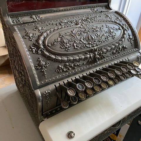Unik gammel dansk National Kasseapparat. Måler 59x39x52 cm. Har masser af patina.