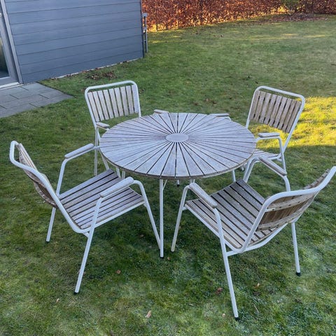 Bordet har stået ude, året rundt. Det betyder, at det har fået noget patina, der efter min mening blot bidrager til dets charme. Og ja, det betyder, at man kan se, at bordet ikke er nyt. At det er originalt.