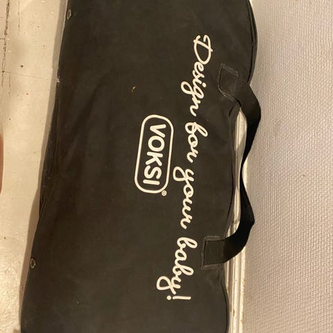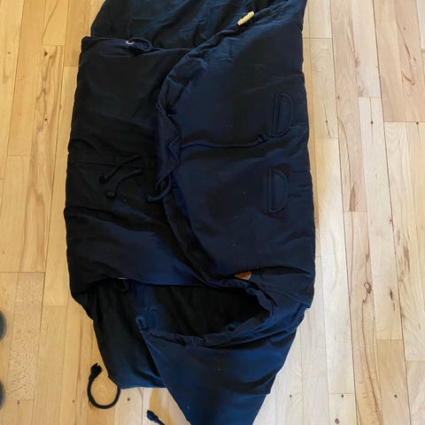 Babysovepose fra sleepbag i sort/grå med bøjler og bæreplade, minder om voksipose classic. Sparsomt brugt til 1 barn. I super god stand.