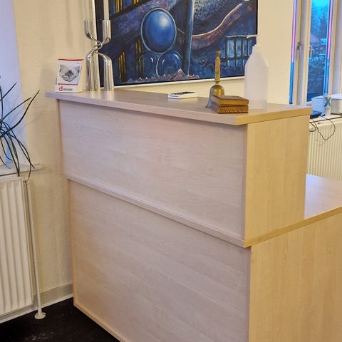 Stilrent receptionsbord i lyst træ med mørke kanter.